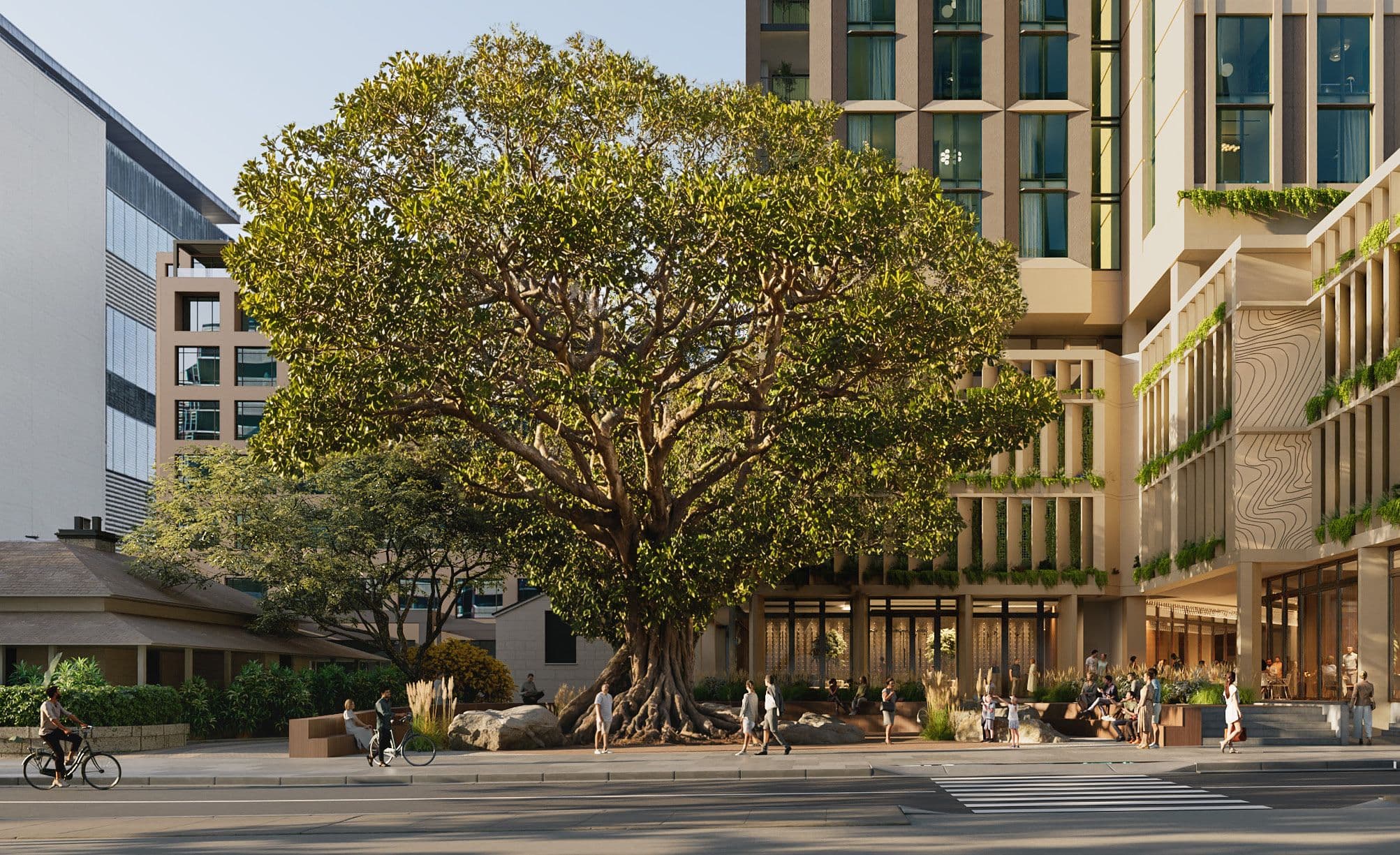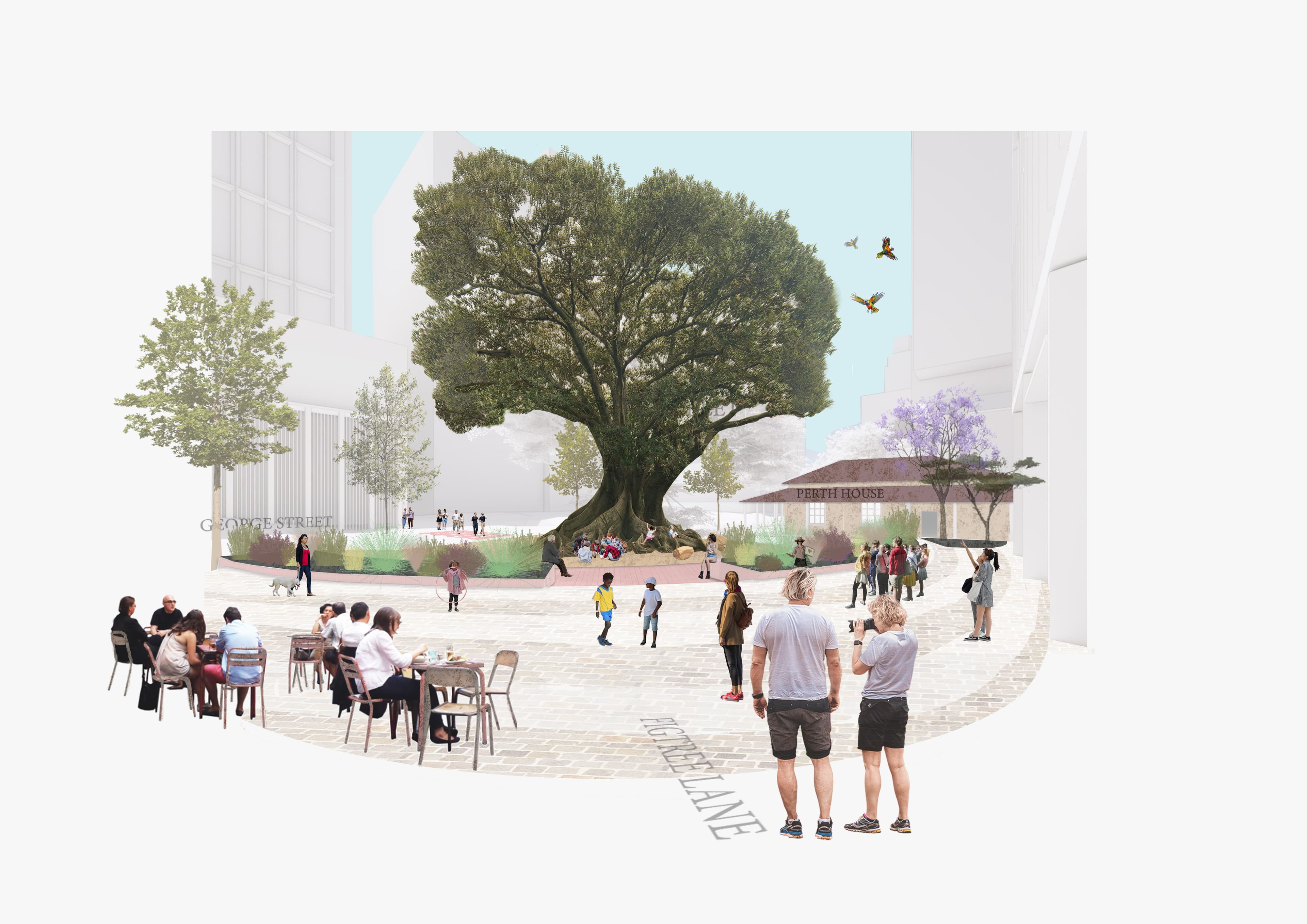 Surrounding heritage features, including Perth House and historic drainage channels, are respectfully integrated into the landscape to reflect the site’s layered colonial and First Nations histories. A central through-site link connects Barrack Lane to the tree, forming a clear and inclusive pedestrian spine. The expanded public realm is enriched with native planting to enhance biodiversity, support climate resilience, and create a distinctive, expressive urban landscape that invites movement, gathering, and community connection.